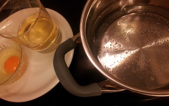 Ponemos en un cazo agua y sal, dejamos hervir y le añadimos el medio vasito de vinagre.
