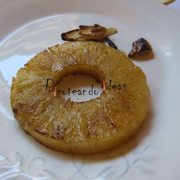 Ponemos la pasta, encima la salsa y adornamos con el salmón y ajo a la plancha, colocamos las rodajas de piña y servimos.