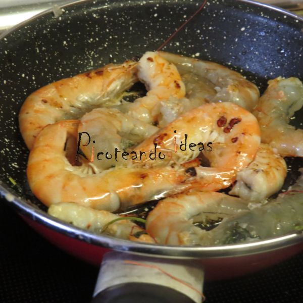 - Rehogamos, ponemos un chorrito de crema de vinagre, retiramos y añadimos los langostinos con unas lascas de sal y sacamos cuando veamos que esté sonrosadas.