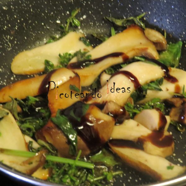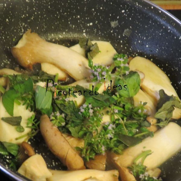 - En una sartén ponemos una cda de aceite de oliva virgen, las setas loncheadas, salpimentamos y añadimos el tomillo y la albahaca.