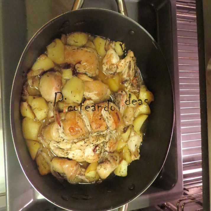 Troceamos el pollo y lo servimos caliente acompañado con el aplastado de las patatas, cebolla y ajos.