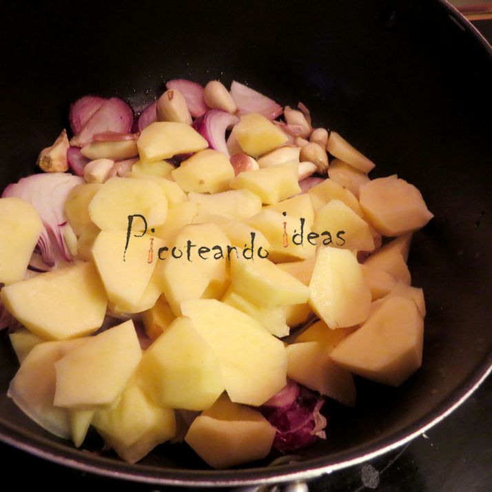 Añadimos también una pizca de agua, ( o el ron) para que no se peguen la cebolla y las patatas.
