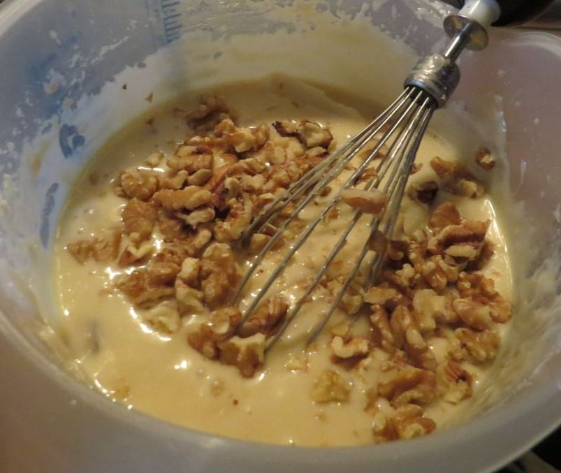 Sacar y pincelar con la mermelada de pera y unos trocitos de nueces.
