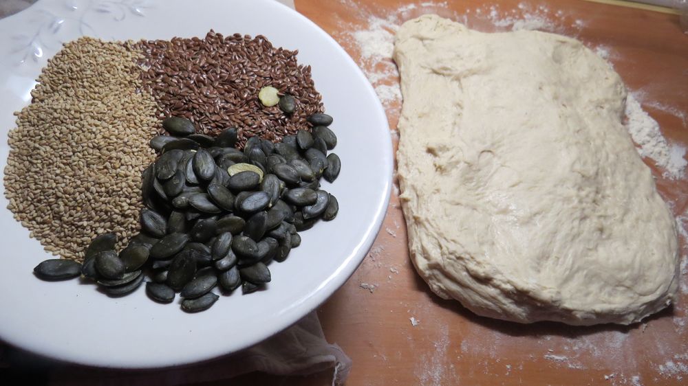 - Para que las semillas se peguen bien, ponemos encima de un paño húmedo la masa y luego colocar encima de la semillas, se deja que suba la masa 40 minutos en un lugar sin corrientes y tapado.