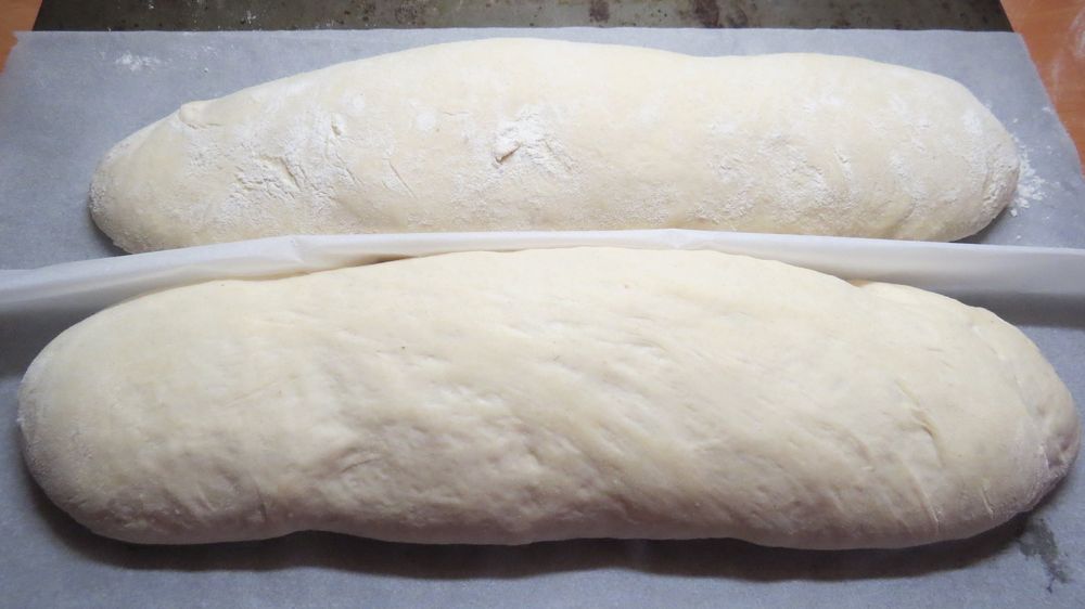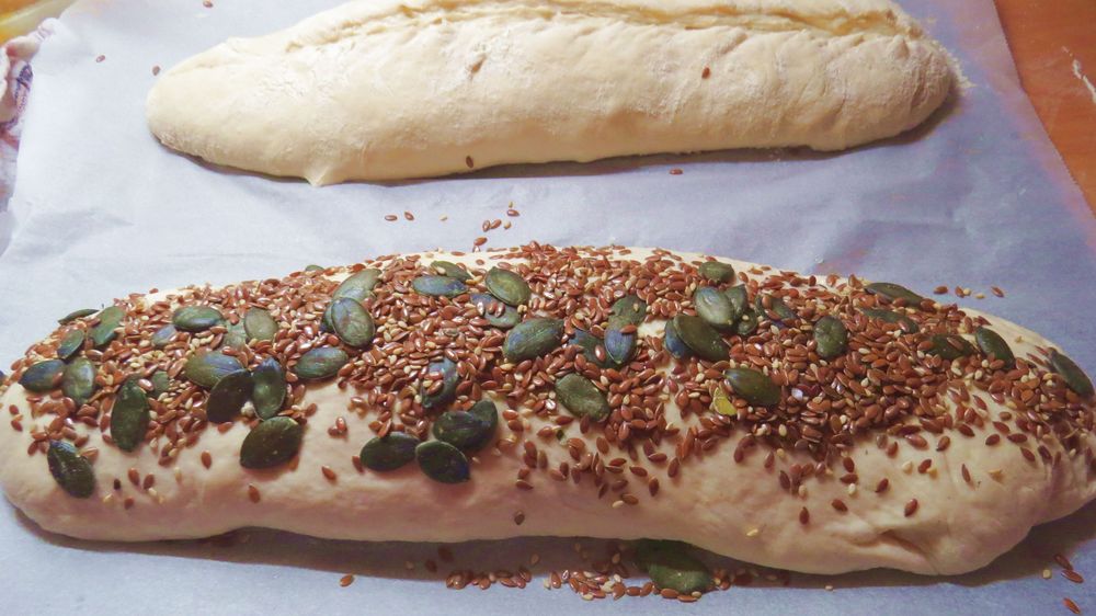 - En esta ocasión la dividí en 2 y preparé dos barras, una cubierta con harina que le hice un corte alargado al pan y otra con semillas.