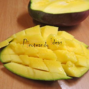 El mango como tiene hueso se corta de arriba a bajo sin pelar y del trozo que no tiene hueso vamos haciendo con un cuchillo cortes, queda en forma de dados, le damos la vuelta a la piel y con el cuchillo sacamos los dados de mango.
