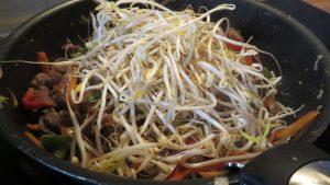En una sartén onda o un wok ponemos el aceite de girasol unas 2 - 3 cucharadas a fuego fuerte, añadir la carne, se rehoga y se incorpora la verdura, le damos unas vueltas y cuando se vea todo integrado le añadimos los brotes de soja y los noodles hidratados (opcional).