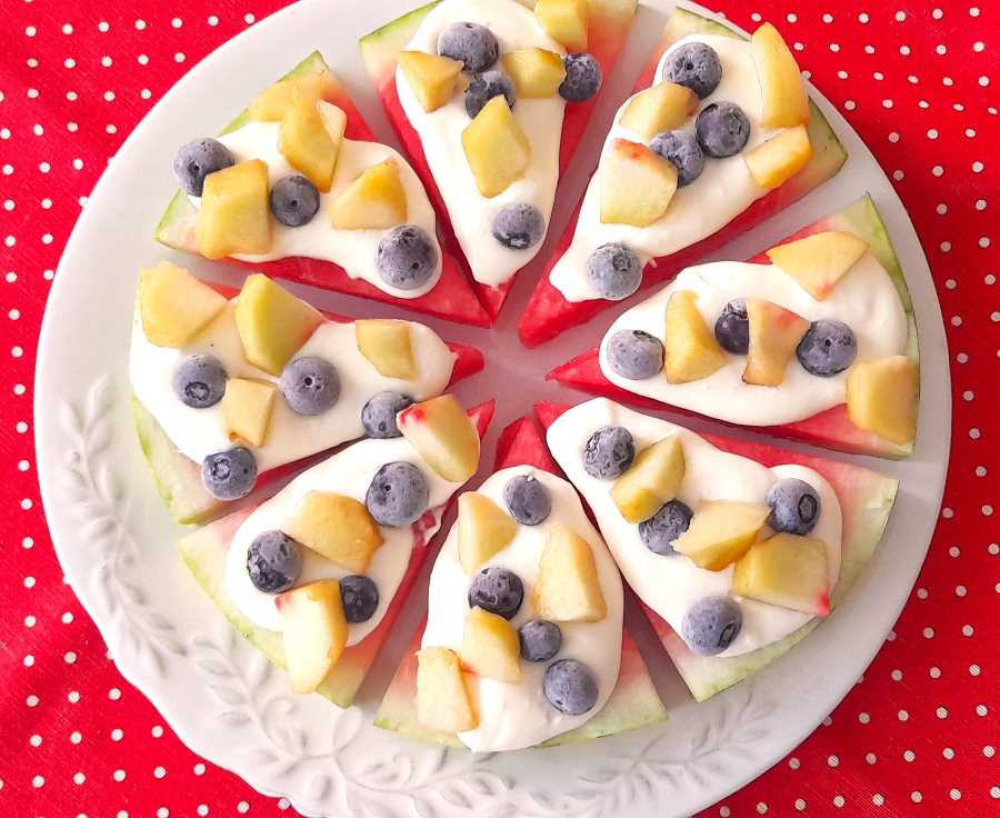 - Cubrir cada rodaja de sandía con la crema de queso, arándanos y paraguaya.