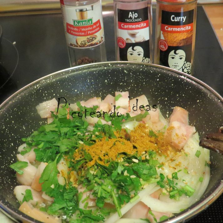 Rehogamos y añadimos, ajo, pimienta, perejil y curry
